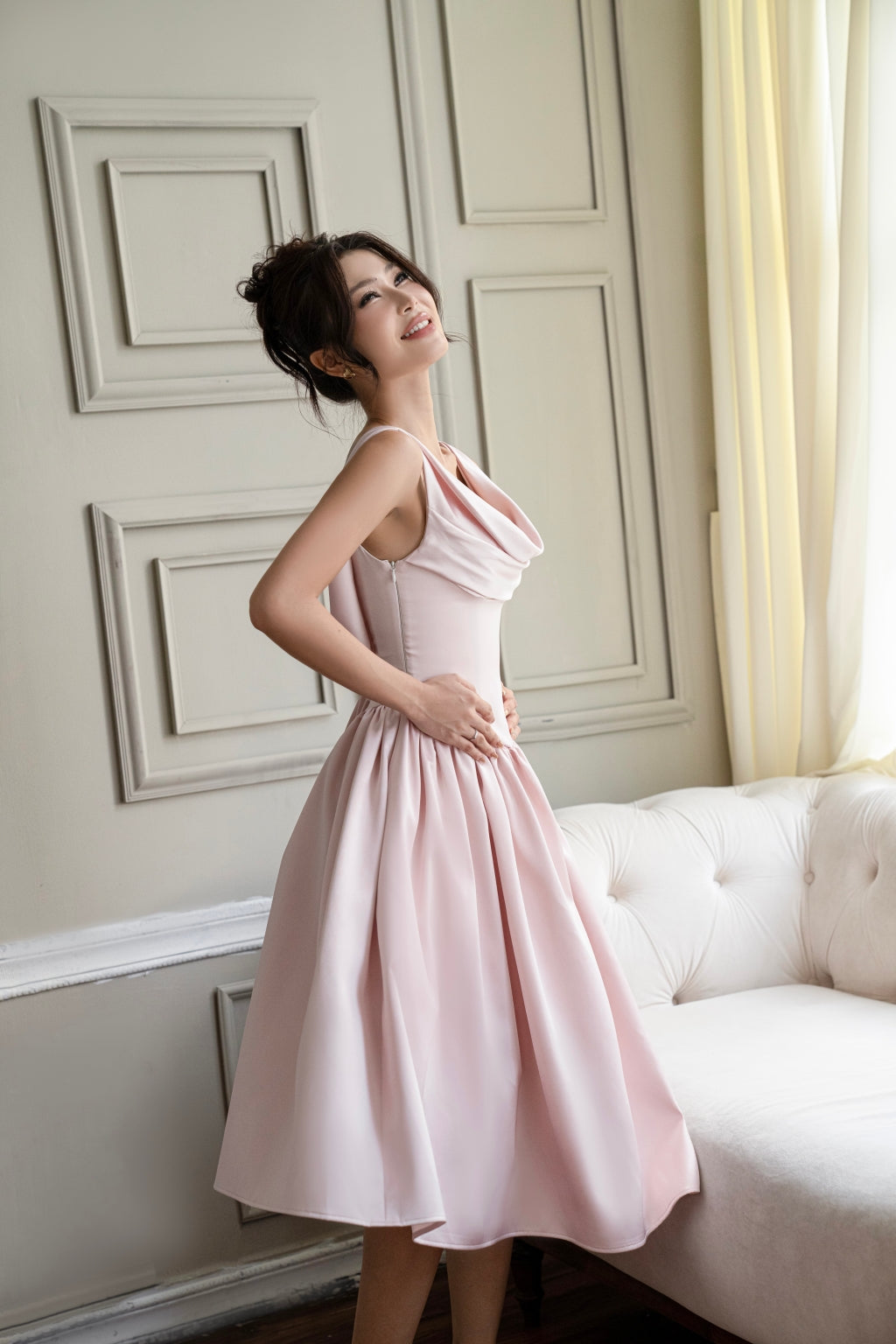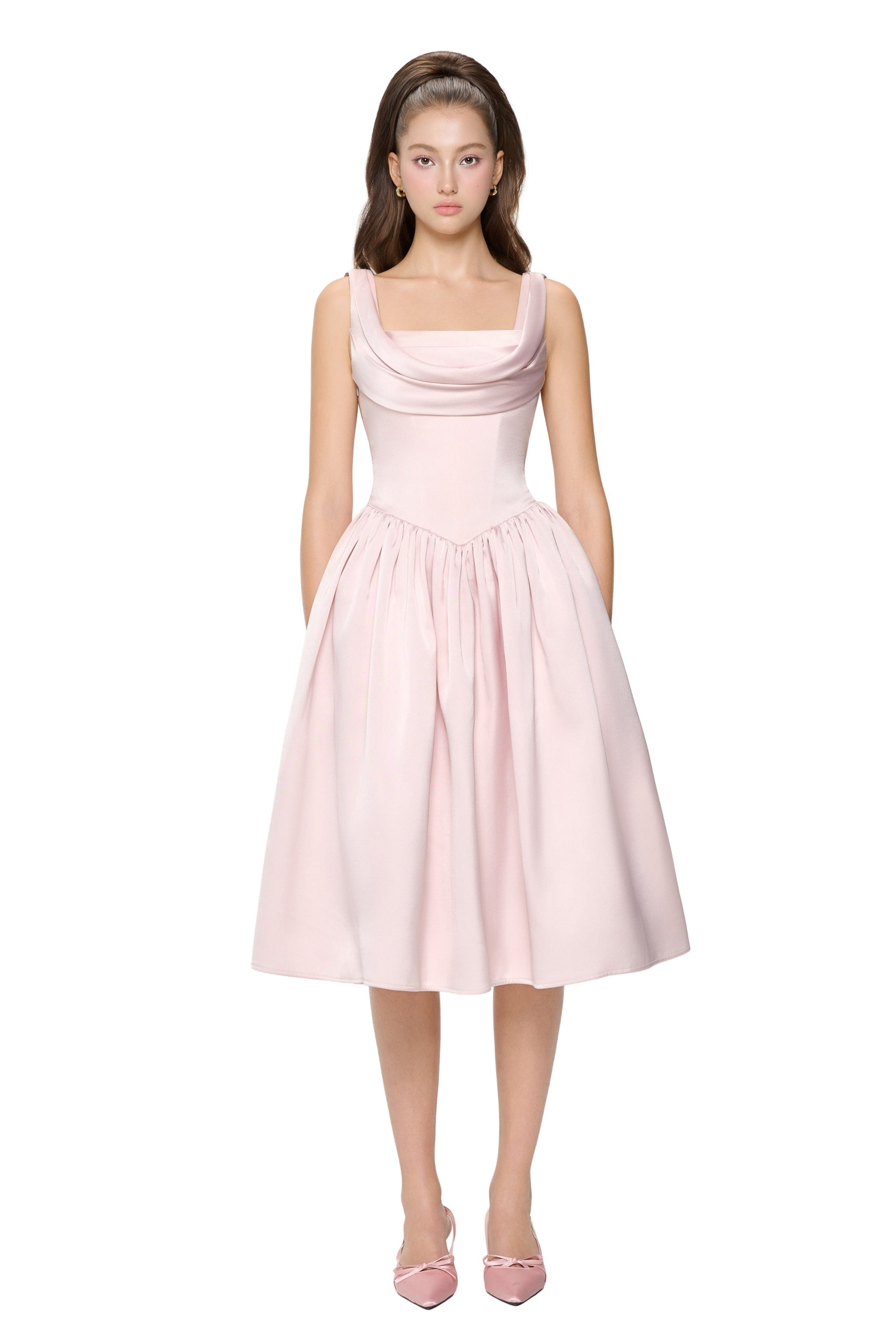 A-line flare dress with draped bust and lace-up back detail. Includes built-in padding and side keyhole zipper.